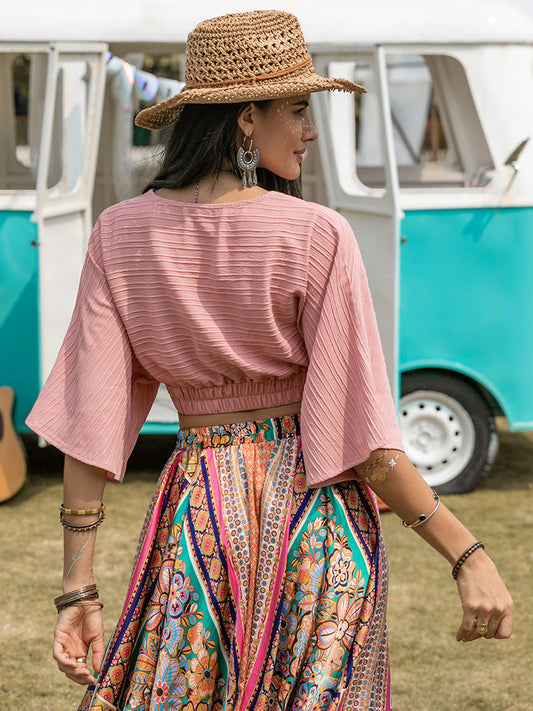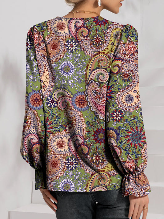 Plus Size Frill Printed V-Neck Long Sleeve Blouse