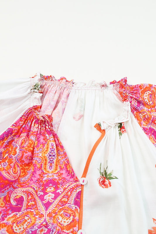 Ruffled Printed Tie Neck Cap Sleeve Blouse